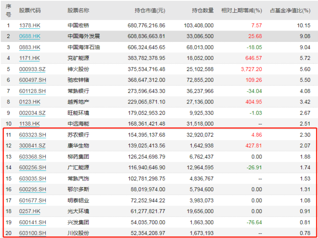 中庚价值品质一年持有第11位至第20位重仓股主要为苏农银行、康华生物、柳药集团、广汇能源、常熟汽饰、鄂尔多斯、明泰铝业、光大环境、兴发集团、川仪股份。