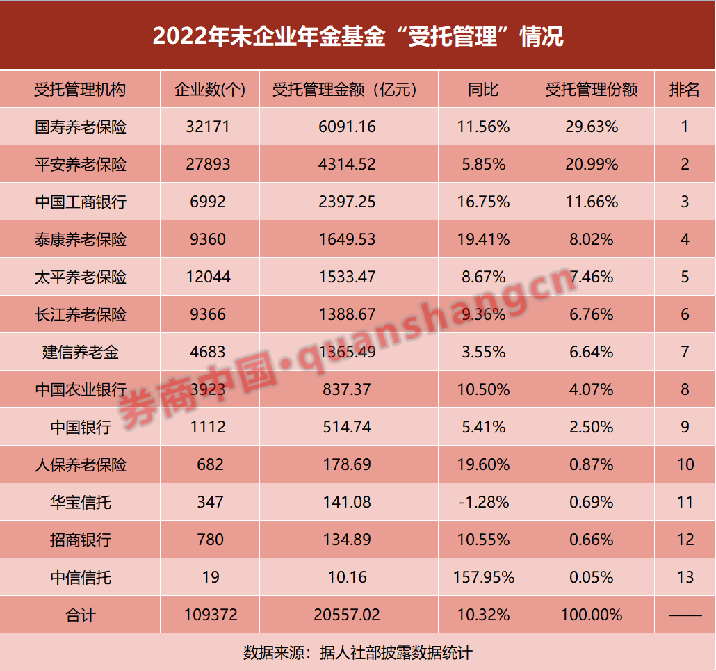 12家受托机构中,保险机构仍是绝对业务主力,合计受托管理企业年金基金1.37万亿元,合计业务份额达到73.7%。其中,国寿养老受托管理超过6000亿元,同比增长11.6%,受托市场份额29.6%,稳居第一;平安养老受托管理4300多亿元,受托份额21%。