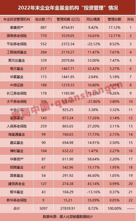 截至2022年末,泰康资产仍是企业年金市场最大的投资管理机构,其管理887个组合,相较上年末增加85个组合;管理规模为4765亿元,同比增长9.4%。据券商中国记者统计,该公司所占投管份额为17.1%,同比增加0.11个百分点。