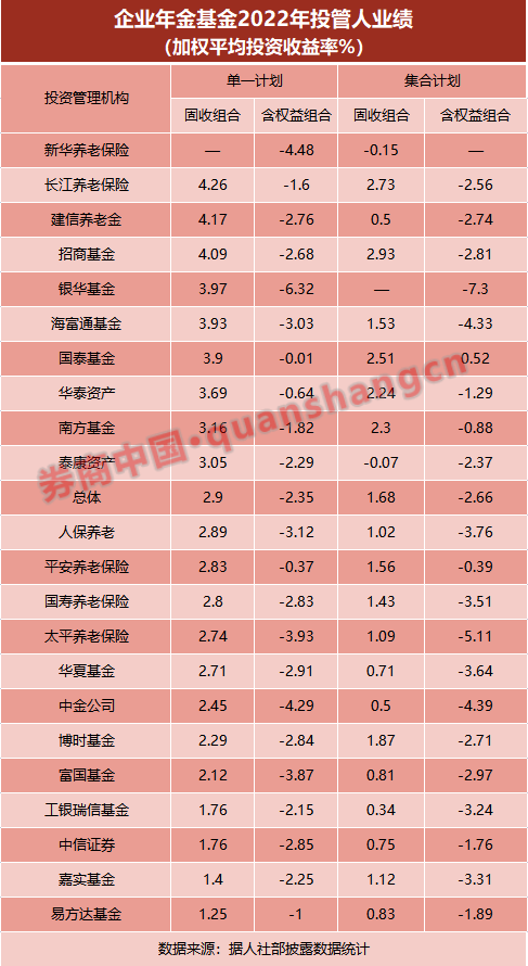 整体上,22家投管人管理的单一计划的固收组合、含权益组合的2022年的平均收益率分别为2.9%、-2.35%,集合计划的固收组合收益率为1.68%、含权益组合收益为-2.66%。