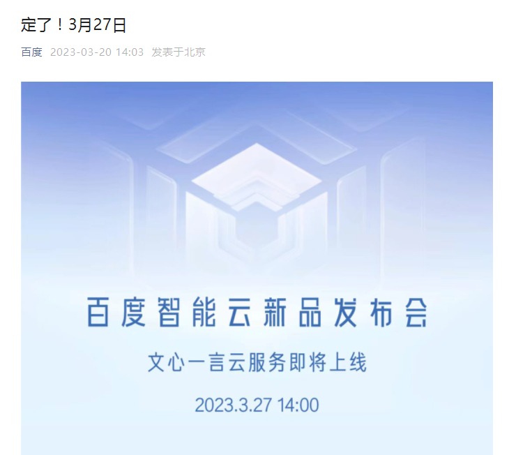 据百度官微3月20日消息,百度智能云将在3月27日召开新品发布会,发布文心一言云服务及应用产品。