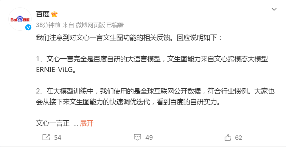 百度回应文心一言文生图质疑:能力来自跨模态大模型 数据使用符合行业惯例
