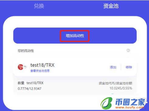 1.选择资金池,点击“增加流动性”按钮,或者在资金池-》您的流动性列表中选择您已经提供的流动性,继续“添加”按钮