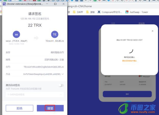 4.页面提示添加资金等待您的钱包确认,请在TronLink请求签名弹框中点击“接受”按钮