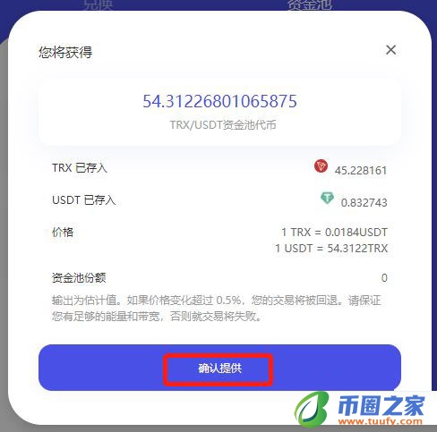 3.在提供流动性确认窗口中,点击“确认提供”按钮