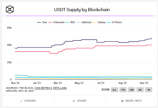 仔细观察这一供应量就会发现,它分布在多个区块链上,其中 Tron 上有 480 亿个,以太坊上有 400 亿个。